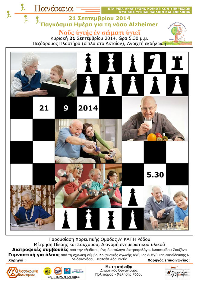 Το Κέντρο Ημερήσιας Φροντίδας Ασθενών με άνοια «Αρσινόη» της Εταιρείας Πανάκεια στα πλαίσια του εορτασμού για την Παγκόσμια Ημέρα Νόσου Alzheimer στις 21 Σεπτεμβρίου 2014 διοργανώνει εκδηλώσεις με κύριο στόχο την ενημέρωση και ευαισθητοποίηση του κοινού σε θέματα άνοιας.