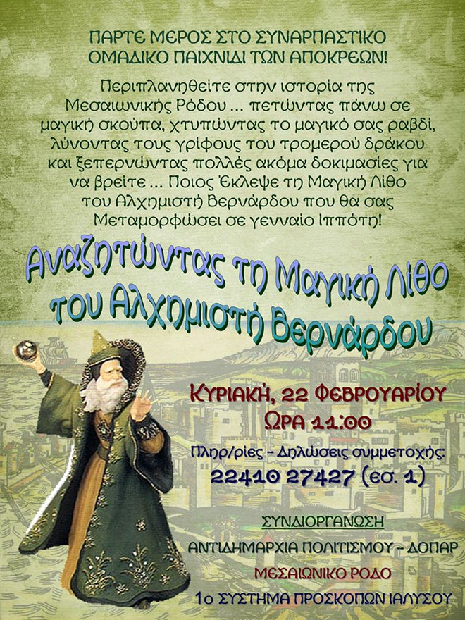 Εν όψει των Απόκρεων, η Αντιδημαρχία Πολιτισμού και ο ΔΟΠΑΡ συνεργάζονται με το σύλλογο “Μεσαιωνικό Ρόδο” και το 1ο Σύστημα Προσκόπων Ιαλυσού για την οργάνωση ενός συναρπαστικού και απόλυτα διασκεδαστικού ομαδικού παιχνιδιού αναζήτησης στη