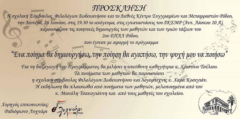Ευχαριστούμε επίσης τα παιδιά της Βασικής Σχολής Τουριστικών Επαγγελμάτων, και τα μουσικά σχήματα του Μουσικού Σχολείου Ρόδου, το συγκρότημα «Nima», τη Φιλαρμονική του Δήμου και τους Dj’s Kostas X και Paschalis Kostas για τις όμορφες μουσικές τους που «έντυσαν» τις εκδηλώσεις.
