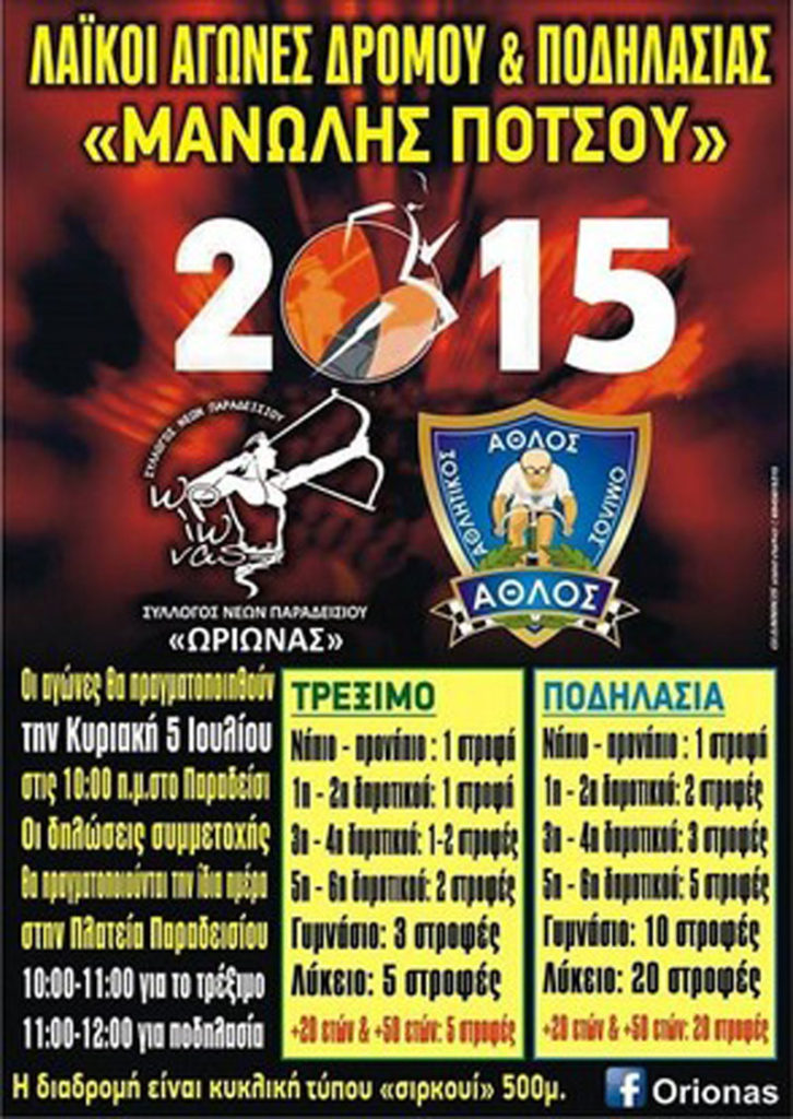 Λαΐκοί Αγώνες Δρόμου & Ποδηλασίας “Μανώλης Πότσου” 2015 Κυριακή 5 Ιουλίου στις 10 το πρωί