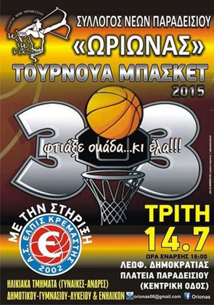 Τουρνουά Μπάσκετ 3 Χ 3 απ’τον Σύλλογο Νέων Παραδεισίου “ΩΡΙΩΝΑΣ” Τρίτη 14 Ιουλίου στις 16:00 στην Πλατεία Παραδεισίου Με την στήριξη του Α.Σ. ΕΛΠΙΣ Κρεμαστής Πηγή: http://www.tranzistoraki.com/