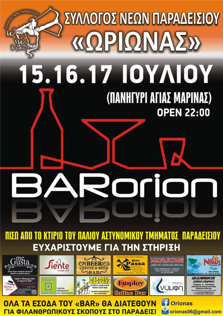 Ο Σύλλογος Νέων Παραδεισίου “Ωρίωνας” με τη βοήθεια και την υποστήριξη όλων των καφέ-μπαρ του Παραδεισίου, σας προσκαλεί σε ένα διαφορετικό χώρο για τις ημέρες της Αγίας Μαρίνας στις 15-16-17 Ιουλίου 2015 (πίσω από το παλιό κτήριο της αστυνομίας) μετά τις 10 το βράδυ με μουσική και ποτό όπου τα έσοδα από όλες τις μέρες […]