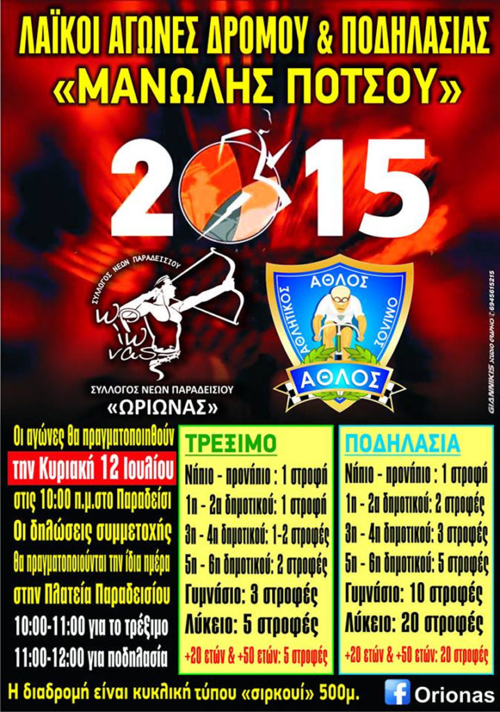 Ο Σύλλογος Νέων Παραδεισίου “Ωρίωνας” θα πραγματοποιήσει και φέτος τους καθιερωμένους αγώνες ποδηλασίας-τρεξίματος “Μανώλης Πότσου” σε συνεργασία με τον ποδηλατικό σύλλογο “Άθλο”. Οι αγώνες θα πραγματοποιηθούν την Κυριακή 12 Ιουλίου 2015 στις 10:00 π.μ. στο Δ.Δ. Παραδεισίου. Οι δηλώσεις συμμετοχής θα πραγματοποιούνται την ίδια ημέρα στην Πλατεία Παραδεισίου (9:00 – 09:50 για το τρέξιμο και 10:00 – […]
