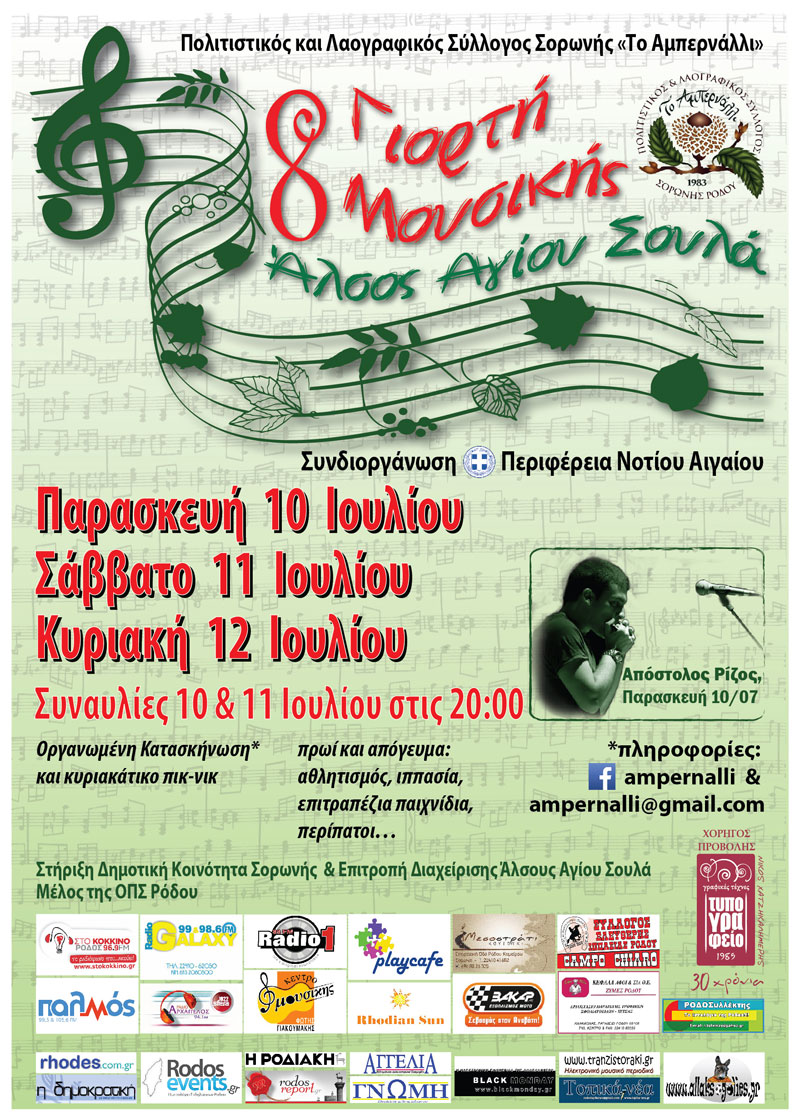 Η “8η Γιορτή Μουσικής” ετοιμάζεται με τη συμμετοχή 16 μουσικών σχημάτων, ελληνικής και ξένης μουσικής, για το τριήμερο 10-12 Ιουλίου 2015 από τον Πολιτιστικό και Λαογραφικό Σύλλογο Σορωνής Ρόδου «Το Αμπερνάλλι».