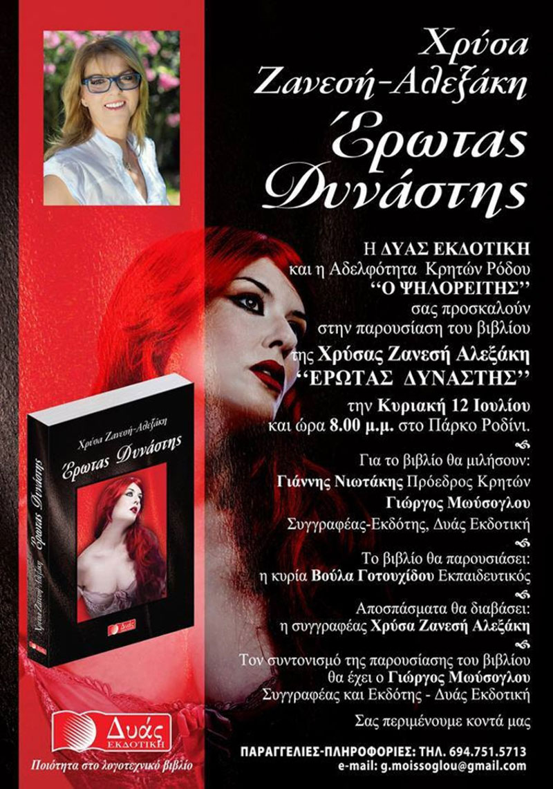 Η Χρύσα Ζανεσή Αλεξάκη, είναι γνωστή ήδη από τα μυθιστορήματα της Σερφάρω αγάπη μου… σερφάρω που κυκλοφόρησε τον Ιούλιο του 2013 και Έρωτας με χρώμα φεγγαριού το Σεπτέμβριο του 2014. Γεννήθηκε στην Κρήτη και ζει μόνιμα στη Ρόδο, όπου και διατηρεί εδώ και αρκετά χρόνια μια επιτυχημένη επιχείρηση.