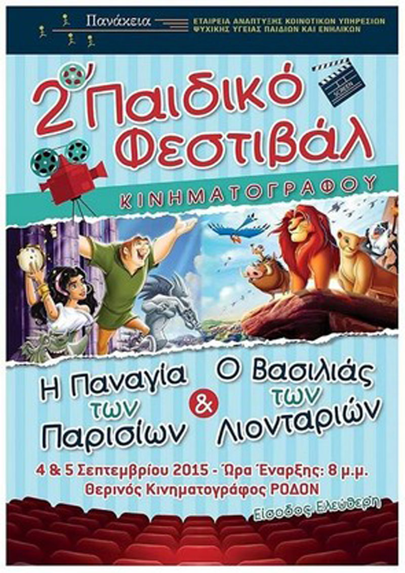 H  Εταιρεία Ανάπτυξης Κοινοτικών Υπηρεσιών Ψυχικής Υγείας Παιδιών και Ενηλίκων «Πανάκεια» και η Περιφέρεια Νοτίου Αιγαίου συνδιοργανώνουν  το 2ο Παιδικό Φεστιβάλ Κινηματογράφου στις 4 και 5 Σεπτεμβρίου 2015 στο Θερινό Κινηματοθέατρο Ρόδον , με στόχο την ευαισθητοποίηση  και ενημέρωση του κοινού και πιο συγκεκριμένα των γονέων σε θέματα οικογενειακών σχέσεων, αξιών και διαπαιδαγώγησης των παιδιών. Θα δίνεται ενημερωτικό φυλλάδιο πριν την προβολή των ταινιών ενώ το προσωπικό της «Πανάκεια» είναι πρόθυμο να απαντήσει στις  απορίες του κοινού.