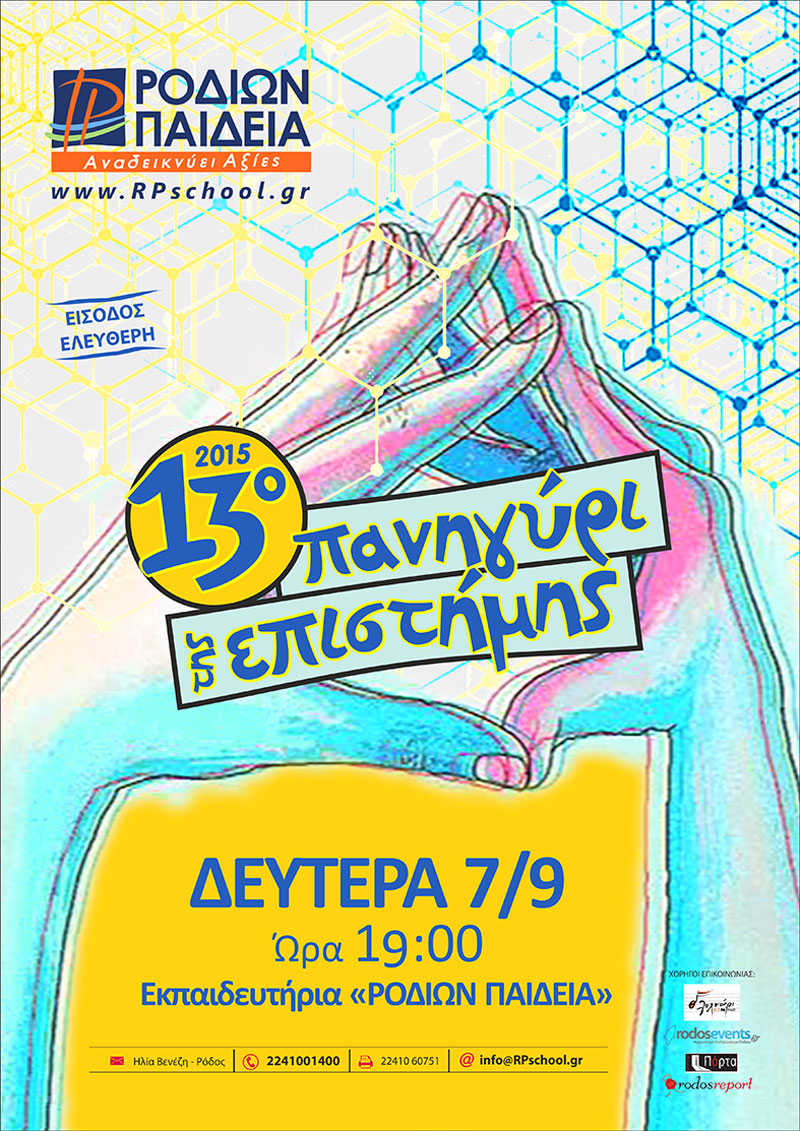 Το «13ο Πανηγύρι της Επιστήμης» θα πραγματοποιηθεί την Δευτέρα 7 Σεπτεμβρίου 2015 στις 7μ.μ., στις εγκαταστάσεις των Εκπαιδευτηρίων «ΡΟΔΙΩΝ ΠΑΙΔΕΙΑ».