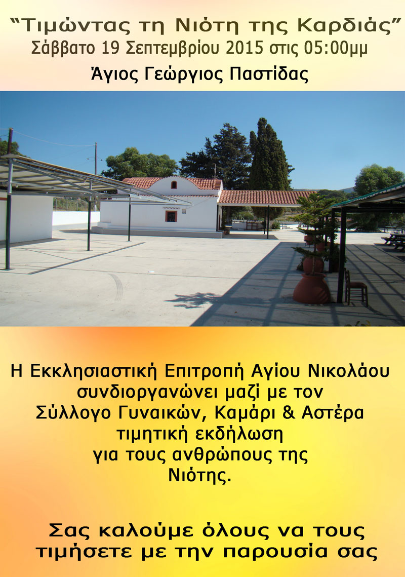 Το Σάββατο βράδυ 19 Σεπτεμβρίου 2015 και ώρα 17:00 στο εξωκλήσι του Αγίου Γεωργίου στην Παστίδα, η Εκκλησιαστική Επιτροπή του Ενοριακού Ναού Αγίου Νικολάου συνδιοργανώνει μαζί με τον Σύλλογο Γυναικών, τον Πολιτιστικό και τον Αθλητικό Σύλλογο Παστίδας, τιμητική εκδήλωση με τίτλο «Τιμώντας τη Νιότη της Καρδιάς» αφιερωμένη στους ανθρώπους της τρίτης ηλικίας που η προσφορά τους στην κοινωνία μας, ήταν είναι και θα είναι ανεκτίμητη.