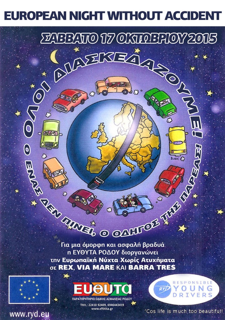 Η ΕΥΘΥΤΑ ΡΟΔΟΥ (www.efthita.gr) για 10η συνεχόμενη χρονιά διοργάνωσε το Σάββατο 17 Οκτωβρίου 2015, τη δράση για την Ευρωπαϊκή Νύχτα Χωρίς Ατυχήματα. Η ΕΥΘΥΤΑ ΡΟΔΟΥ, ήταν ο φορέας που για πρώτη φορά τον Οκτώβριο του 2006, διοργάνωσε την Ευρωπαϊκή Νύχτα Χωρίς Ατυχήματα στην Ελλάδα, σε συνεργασία με τους RYD (Responsible Young Drivers) του Βελγίου με […]