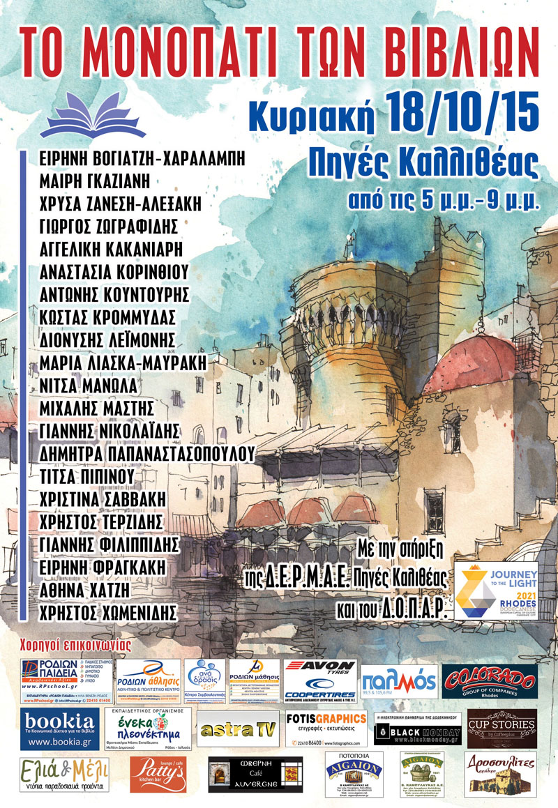 Οι Πηγές Καλλιθέας, την Κυριακή 18 Οκτωβρίου, φιλοξενούν για άλλη μία φορά φέτος, μια σημαντική πολιτιστική εκδήλωση το «μονοπάτι των βιβλίων», όπου κορυφαίοι συγγραφείς από μεγάλους εκδοτικούς οίκους της Ελλάδας, θα τιμηθούν για τα μυθιστορήματα τους που έχουν αναφορά στο νησί της Ρόδου.