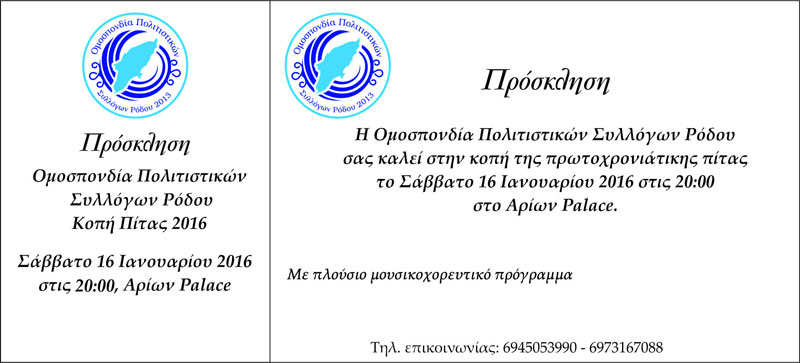 Αξιότιμοι κύριοι-ες, Η Ομοσπονδία Πολιτιστικών Συλλόγων Ρόδου σας προσκαλεί στην κοπή της πρωτοχρονιάτικης πίτας το Σάββατο 16 Ιανουαρίου 2016 στις 20:00 στο Αρίων Palace. H παρουσία σας θα μας τιμήσει ιδιαίτερα. Με εκτίμηση Εκ μέρους της Ο.Π.Σ Ρόδου ΜΠΕΤΥ ΒΛΑΧΟΥ