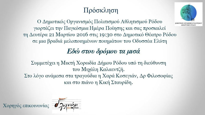 Η Στέγη Γραμμάτων και Τεχνών Δωδεκανήσου προσκαλεί τους Δωδεκανήσιους ποιητές, καλλιτέχνες και τους πολιτιστικούς φορείς, να συμμετάσχουν στην εκδήλωση η οποία θα πραγματοποιηθεί στις 20 Μαρτίου 2016, ημέρα Κυριακή με την ευκαιρία εορτασμού της παγκόσμιας ημέρας ποίησης (31η Μαρτίου). Η πανελλήνια / παγκόσμια εκδήλωση ΕΝΑ ΠΟΙΗΜΑ ΓΙΑ ΤΟΥΣ ΠΡΟΣΦΥΓΕΣ θα γίνει στις 21 Μαρτίου 2016, (στη […]