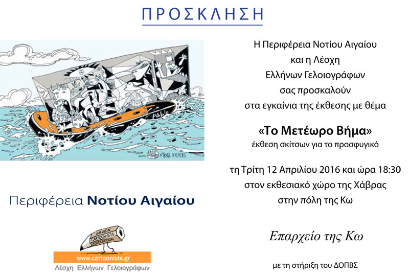 Στο νησί της Κω μεταφέρεται η μεγάλη Έκθεση σκίτσου για το προσφυγικό “Το Μετέωρο Βήμα”, που συνδιοργανώνουν η Περιφέρεια Νοτίου Αιγαίου και η Λέσχη Ελλήνων Γελοιογράφων.