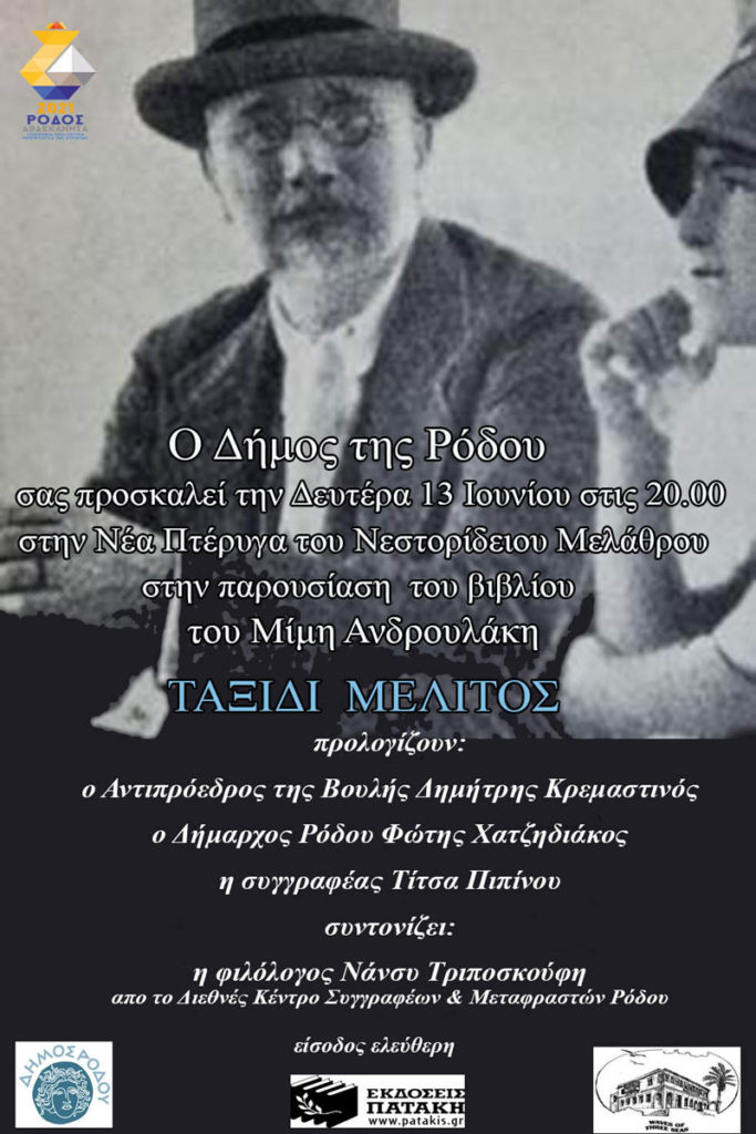 Την Δευτέρα 13 Ιουνίου 2016 στις 20.00, στην Νέα πτέρυγα του Νεστορίδειου Μελάθρου, ο Δήμος Ρόδου (Αντιδημαρχία Πολιτισμού),σε συνεργασία με το Διεθνές Κέντρο Λογοτεχνών & Μεταφραστών Ρόδου και τις εκδόσεις ΠΑΤΑΚΗ, σας προσκαλούν στην παρουσίαση του νέου βιβλίου του συγγραφέα Μίμη Ανδρουλάκη «ΤΑΞΙΔΙ ΜΕΛΙΤΟΣ». Θα προλογίσουν ο Αντιπρόεδρος της Βουλής Δημήτρης Κρεμαστινός, ο Δήμαρχος Ρόδου […]