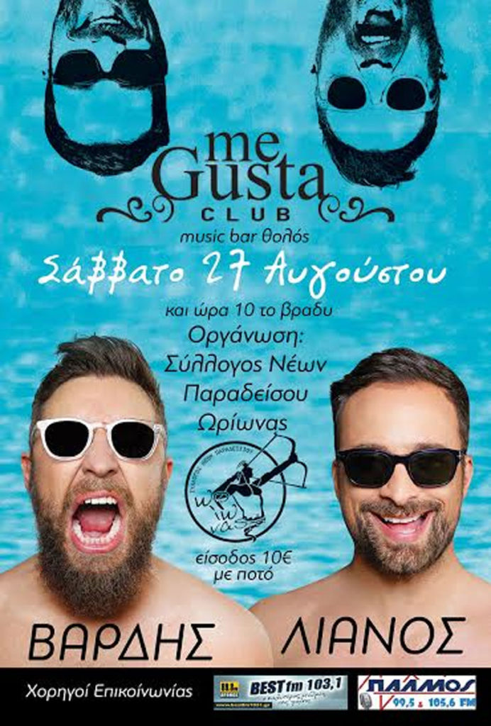 Ο Σύλλογος Νέων Παραδεισίου Ωρίωνας σας προσκαλεί σε μια live βραδιά με το Γιάννη Βαρδή και το Γιώργο Λιανό στις 27 Αυγούστου 2016 και ώρα 22:00 στο <<ME GUSTA MUSIC BAR>> στην Θολό (έναντι από το ξενοδοχείο Doreta). H είσοδος θα είναι 10 ευρώ με ποτό. Οργάνωση: Σύλλογος Νέων Παραδεισίου Ωρίωνας