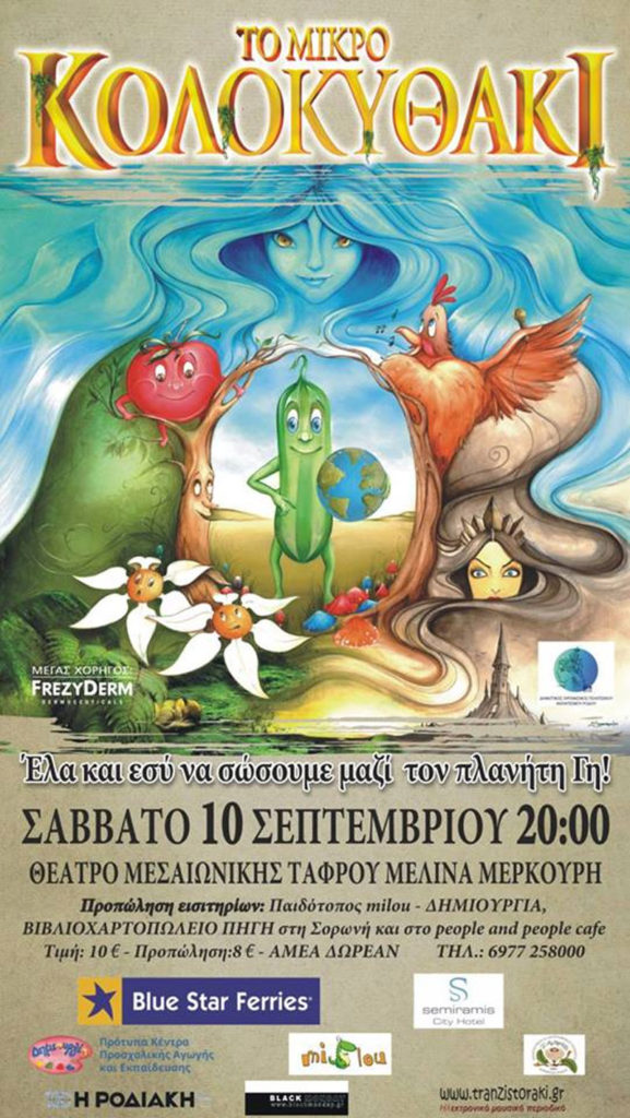 Παιδική Θεατρική Παράσταση «ΤΟ ΜΙΚΡΟ ΚΟΛΟKΥΘΑΚΙ» σε σκηνοθεσία Δημήτρη Πιέτρη Παίζουν οι ηθοποιοί: Δημήτρης Παπαδάτος – Ίντρα Κέιν – Τόνια Παπαδάκη – Δημήτρης Πιέτρης Φιλική συμμετοχή σε βίντεο-προβολή Χριστίνα Κουλούμπη Στο ρόλο της μάγισσας η Τζώρζια Κεφαλά του συγκροτήματος ΜΠΛΕ 10 Σεπτεμβρίου, ώρα 20:30, Θέατρο Μεσαιωνικής Τάφρου «ΜΕΛΙΝΑ ΜΕΡΚΟΥΡΗ» Διοργάνωση «Εργοστάσιο Ονείρου» – Υπό την αιγίδα του […]