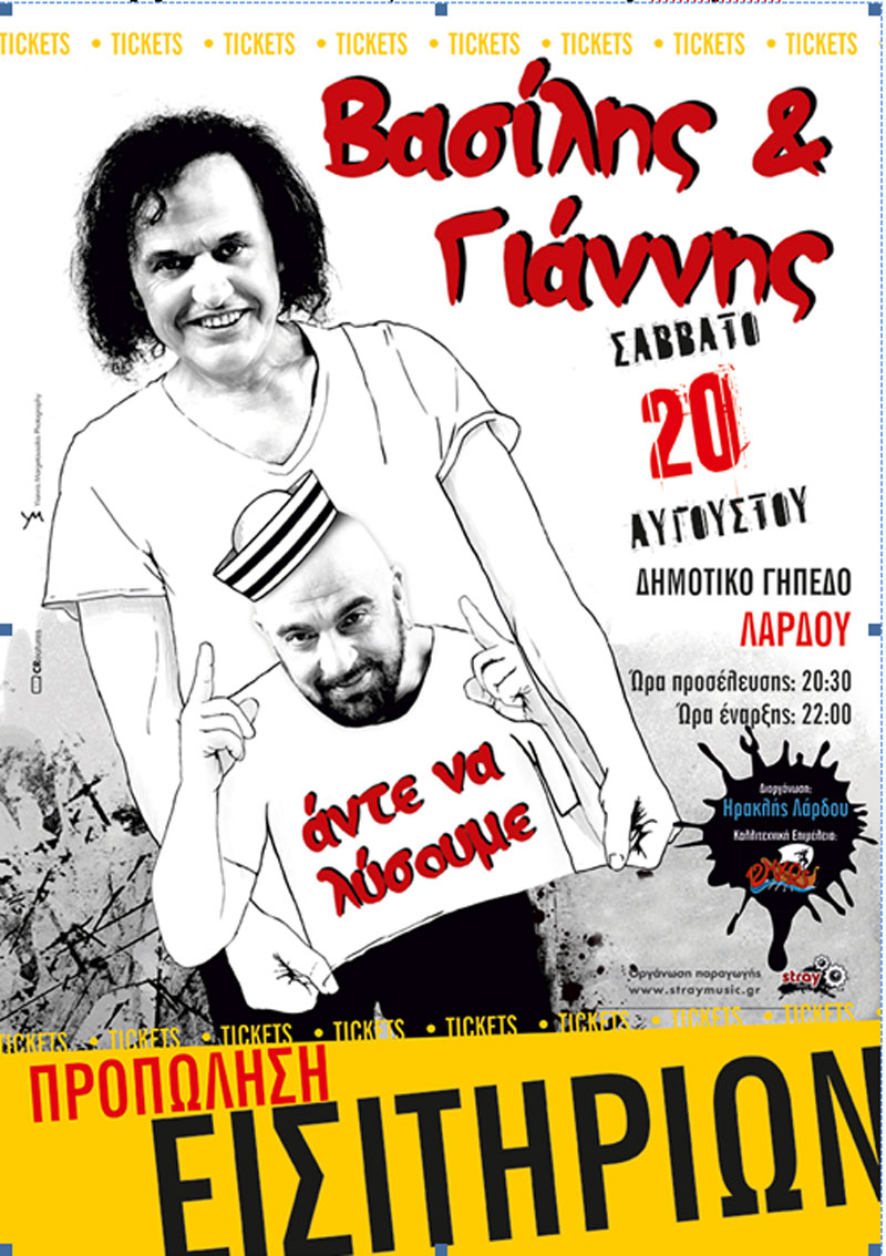 Μ’ αυτό το ρεφρέν θα ξεκινήσουν την παράσταση τους ο Βασίλης και ο Γιάννης το Σάββατο 20 Αυγούστου στο Δημοτικό Γήπεδο Λάρδου, θέλοντας να μας δώσουν το δικό τους μήνυμα, «ΑΝΤΕ ΝΑ ΛΥΣΟΥΜΕ…».