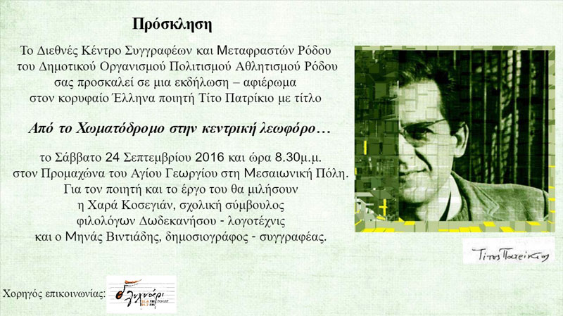 Το Διεθνές Κέντρο Συγγραφέων και Μεταφραστών Ρόδου του ΔΟΠΑΡ σας προσκαλεί στην εκδήλωση προς τιμή του Τίτου Πατρίκιου που θα πραγματοποιηθεί το Σάββατο 24 Σεπτεμβρίου και ώρα 8.30 μ.μ. στον Προμαχώνα του Αγίου Γεωργίου στη Μεσαιωνική Πόλη.