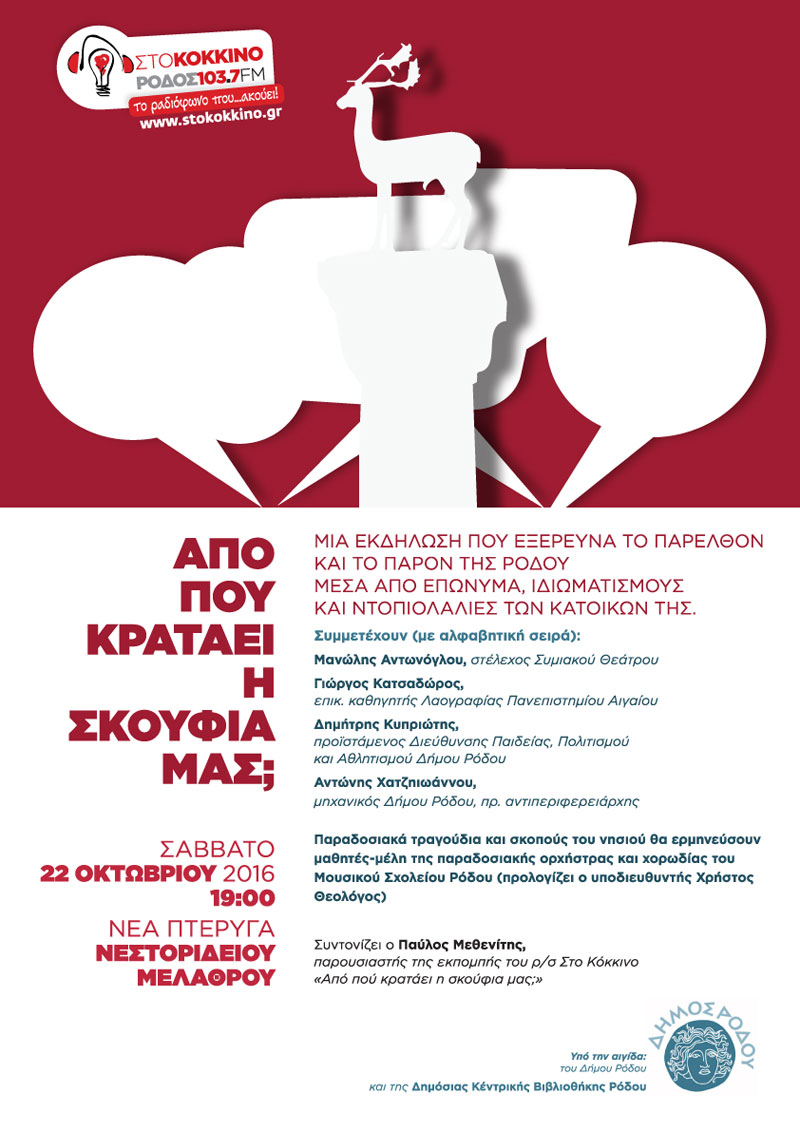 Ο ραδιοφωνικός σταθμός 103,7 Στο Κόκκινο Ρόδου σας προσκαλεί, το Σάββατο 22 Οκτωβρίου 2016, στις 7 μ.μ., σε μια εκδήλωση που εξερευνά το παρελθόν και το παρόν της Ρόδου μέσα από επώνυμα, ιδιωματισμούς και ντοπιολαλιές των κατοίκων της.
