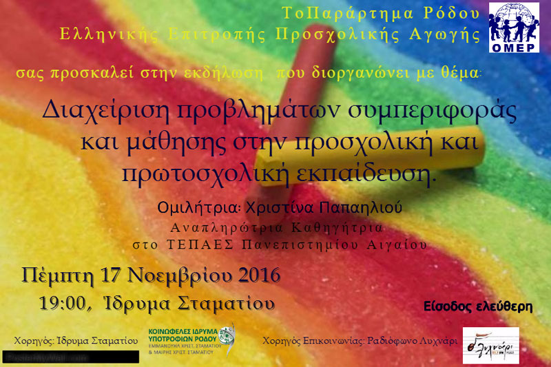 Η εκδήλωση θα πραγματοποιηθεί την Πέμπτη 17 Νοεμβρίου 2016 και ώρα 19:00 στην αίθουσα εκδηλώσεων του Ιδρύματος Σταματίου και απευθύνεται σε νηπιαγωγούς, δασκάλους και φοιτητές Παιδαγωγικών Τμημάτων.