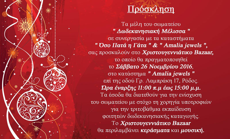 Μια όμορφη εκδήλωση αλληλεγγύης που υπηρετεί τους σκοπούς της Δωδεκανησιακής Μέλισσας, πήραν την πρωτοβουλία να οργανώσουν τα καταστήματα «Amalia jewels» & «Όσο πατά η γάτα», το Σάββατο 26 Νοεμβρίου 2016, μπροστά στο πρώτο κατάστημα, Γρηγ. Λαμπράκη 17, από τις 11.00 το πρωί ως τις 15.00.