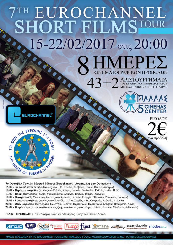 Το 7ο Φεστιβάλ Ταινιών Μικρού Μήκους Eurochannel επιστρέφει από το Σπίτι της Ευρώπης στη Ρόδο: 43+2 ταινίες μικρού μήκους,8 ημέρες προβολών.Στον Κινηματογράφο Παλλάς από τις 15 έως τις 22 Φεβρουαρίου 2017 στις 20:00. Το Φεστιβάλ Ταινιών Μικρού Μήκους του αμερικανικού δικτύου Eurochannel είναι ένας πετυχημένος θεσμός για τον Ευρωπαϊκό Κινηματογράφο, που από το 2013 φιλοξενείται […]