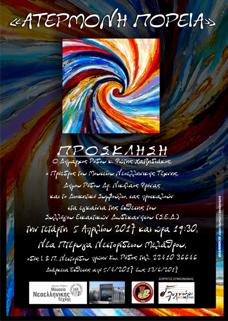 Έκθεση Συλλόγου Εικαστικών Δωδεκανήσου (ΣΕΔ) με θέμα: «Ατέρμονη πορεία»,στη Νέα Πτέρυγα Νεστορίειου Μελάθρου. Εγκαίνια: Τετάρτη 5 Απριλίου,19:30 μ.μ. Διάρκεια έκθεσης: Από 5/4 έως 13/6