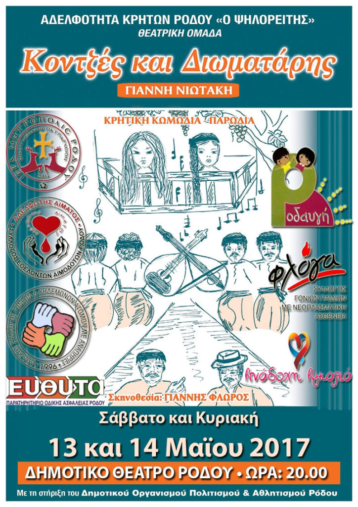 Η Θεατρική Ομάδα της Αδελφότητας Κρητών Ρόδου,παρουσιάζει το θεατρικό έργο του Γιάννη Νιωτάκη «Κοντζές και Διωματάρης» μια Κρητική κωμωδία για να γελάσετε μέχρι δακρύων… Σκηνοθεσία: Γιάννης Φλώρος Σάββατο 13 και Κυριακή 14 Μαΐου 2017 Ώρα 20:00 Δημοτικό Θέατρο Ρόδου Είσοδος: 5 € Οι παραστάσεις θα δοθούν για να στηριχθούν οι φορείς: Φιλόπτωχο Ταμείο Ι. Μητρόπολης […]