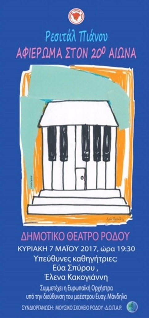 Το Μουσικό Σχολείο Ρόδου σε συνδιοργάνωση με τον Δημοτικό Οργανισμό Πολιτισμού – Αθλητισμού Ρόδου (Δ.Ο.Π.Α.Ρ.) έχουν την τιμή και τη χαρά να σας προσκαλέσουν σε ρεσιτάλ πιάνου αφιερωμένο στον 20ο αιώνα,που θα πραγματοποιηθεί την Κυριακή 7 Μαΐου και ώρα 7.30 μ.μ. στο Δημοτικό Θέατρο Ρόδου.Στην εκδήλωση συμμετέχει και η Ευρωπαϊκή Ορχήστρα του Μουσικού Σχολείου. Η […]