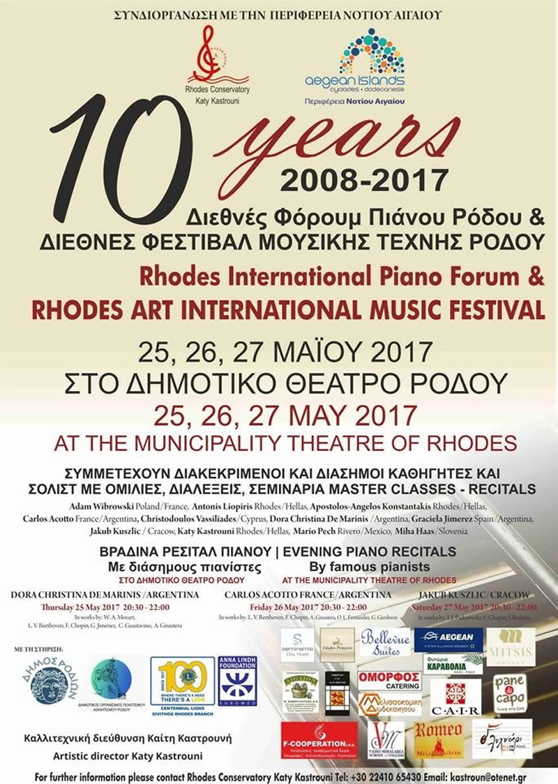 Το Διεθνές Φόρουμ Πιάνου Ρόδου και Διεθνές Φεστιβάλ Μουσικής Τέχνης Ρόδου,γιορτάζει την 10η επέτειο πραγματοποίησής του στις 25-28 Μαΐου 2017,με συμμετοχή διακεκριμένων καθηγητών Πιάνου και Σολίστ Μουσικής από την Ελλάδα και το εξωτερικό.