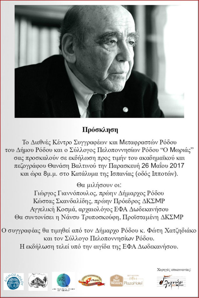 Το Διεθνές Κέντρο Συγγραφέων και Μεταφραστών Ρόδου του ΔΟΠΑΡ σας προσκαλεί στην εκδήλωση προς τιμήν του πεζογράφου και ακαδημαϊκού Θανάση Βαλτινού που θα πραγματοποιηθεί την Παρασκευή 26 Μαΐου 2017 και ώρα 20.00 στο Ισπανικό Κατάλυμα στη Μεσαιωνική Πόλη. Σας περιμένουμε. Δημοτικός Οργανισμός Πολιτισμού Αθλητισμού Ρόδου Διεθνές Κέντρο Συγγραφέων και Μεταφραστών Ρόδου Αντιπλοιάρχου Λάσκου 10α,851 33 […]
