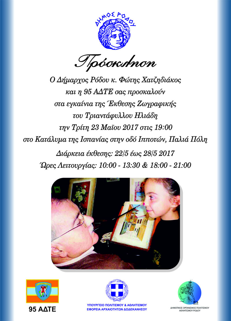 Με ιδιαίτερη χαρά,σας προσκαλούμε στα Εγκαίνια της Έκθεσης Ζωγραφικής του Τριαντάφυλλου Ηλιάδη την Τρίτη 23 Μαΐου 2017,στις 19:00 στο Κατάλυμα της Ισπανίας.
