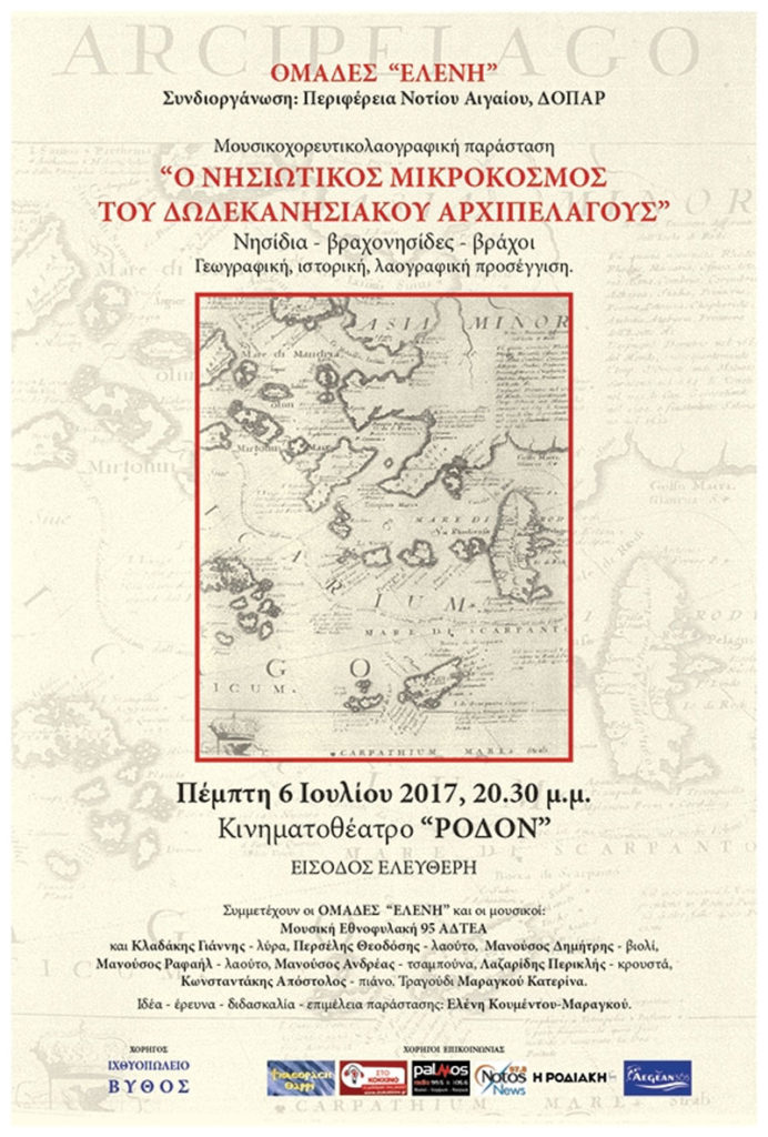 Οι Ομάδες «ΕΛΕΝΗ» παρουσιάζουν την παράσταση «Ο ΝΗΣΙΩΤΙΚΟΣ ΜΙΚΡΟΚΟΣΜΟΣ ΤΟΥ ΔΩΔΕΚΑΝΗΣΙΑΚΟΥ ΑΡΧΙΠΕΛΑΓΟΥΣ» Νησίδια –βραχονησίδες – βράχοι. Πέμπτη 6 Ιουλίου, στις 8.30 μ.μ στο κινηματοθέατρο ΡΟΔΟΝ. Η παράσταση είναι εμπνευσμένη από το ομότιτλο βιβλίο του Μιχάλη Σκανδαλίδη, και είναι αφιερωμένη στους πεσόντες και εν ενεργεία πιλότους της Πολεμικής Αεροπορίας. Ιδέα- έρευνα-διδασκαλία επιμέλεια παράστασης: Ελένη Κουμέντου-Μαραγκού Συνδιοργάνωση: […]