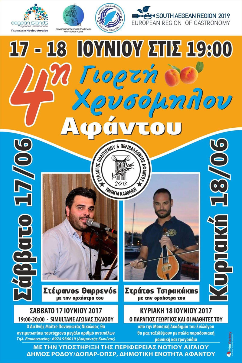 Ο Σύλλογος Πολιτισμού και Περιβάλλοντος Αφάντου «Παναγιά Καθολική»,η Δημοτική Ενότητα Αφάντου,ο Δήμος Ρόδου – Δ.Ο.Π.Α.Ρ., η Περιφέρεια Νοτίου Αιγαίου και η Ομοσπονδία Πολιτιστικών Συλλόγων Ρόδου σας καλούν στην 4η Γιορτή Χρυσόμηλου. Η εκδήλωση πραγματοποιείται στις 17 και 18 Ιουνίου 2017,στις 19:00,στο χωριό Αφάντου της Ρόδου.Στο διήμερο της γιορτής θα προσφερθούν παραδοσιακά εδέσματα όπως γλυκό χρυσόμηλου και αφαντενές τηγανίτες,θα παρουσιαστούν παραδοσιακά χορευτικά ενώ θα ακολουθήσει παραδοσιακό γλέντι με την ορχήστρα του Στέφανου Θαρρενού το Σάββατο και του Στράτου Τσιρακάκη την Κυριακή.