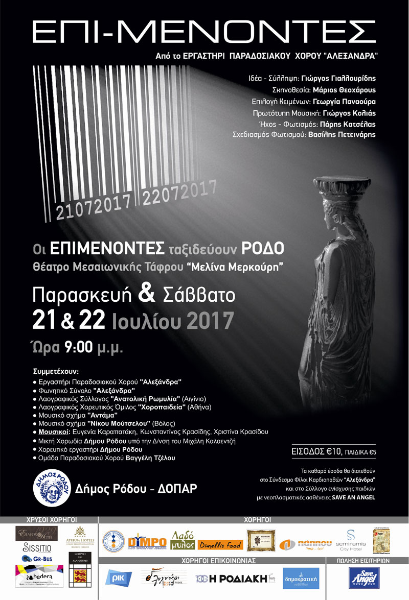 Την Παρασκευή 21 και το Σάββατο 22 Ιουλίου, ο Δήμος Ρόδου- Δ.Ο.Π.Α.Ρ. και η Δημοτική Κοινότητα Ρόδου φιλοξενούν το Εργαστήρι Παραδοσιακών Χορών Αλεξάνδρα από την Κύπρο, σε ένα πάντρεμα των τεχνών. Γράφει χαρακτηριστικά ο εμπνευστής της παράστασης Γιώργος Γιαλλουρίδης: «Η κρίση των αξιών και η πολιτισμική ισοπέδωση που χαρακτηρίζουν την εποχή μας αποτέλεσαν την αφετηρία της παράστασης «ΕΠΙ-ΜΕΝΟΝΤΕΣ». Κατά τον Ελύτη, «ερχόμαστε από μακριά», επομένως η πρόσκληση για αντίδραση και δράση στις προκλήσεις του καιρού μας δεν μπορεί παρά να οδηγεί στην επανεύρεση της ταυτότητας και στην κατάκτηση της αυτοσυνειδησίας μας. Θαμπωμένοι από τη μοναδικότητα της φυσιογνωμίας του πολιτισμού μας, επιστρατεύουμε τις τέχνες, για να εκφράσουν την πίστη στον άνθρωπο και την επιμονή να στηριχτούμε σε όσα μας ορίζουν, σε όσα μας συνθέτουν για να «βγούμε από τη συμφορά του χρόνου». Ο χορός – σύγχρονος και παραδοσιακός, η μουσική, ο λόγος – ποιητικός, θεατρικός και πεζός, σμίγουν σε ένα ταξίδι αναζήτησης, σε ένα ταξίδι προς το φως.