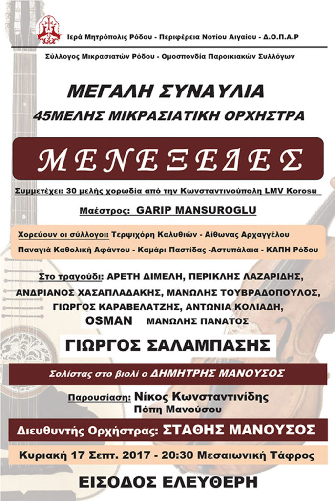 45ΜΕΛΗΣ ΜΙΚΡΑΣΙΑΤΙΚΗ ΟΡΧΗΣΤΡΑ “ΜΕΝΕΞΕΔΕΣ” Συμμετέχει: 30μελής χορωδία από την Κωνσταντιούπολη LMV KOROSU με μαέστρο τον GARIP MANSUROGLU Χορευτικά: Τερψιχώρη Καλυθιών – Αίθωνας Αρχαγγέλου – Παναγιά Καθολική Αφάντου – Καμάρι Παστίδας – Αστυπάλαιας – ΚΑΠΗ Ρόδου Τραγούδι: Αρετή Διμέλη, Περικλής Λαζαρίδης, Ανδριανός Χασαπλαδάκης, Μανώλης Τουβραδόπουλος, Γιώργος Καραβέλατζης, Αντωνία Κολιάδη, Osman, Μανώλης Πανάτος και ΓΙΩΡΓΟΣ ΣΑΛΑΜΠΑΣΗΣ Σολίστας […]