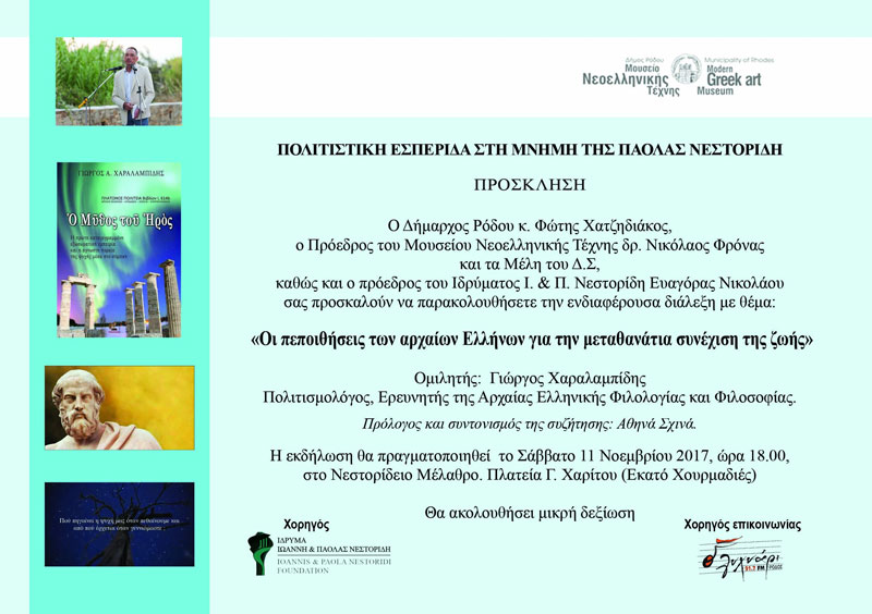 Η διάλεξη βασίζεται αποκλειστικά στην ερμηνεία των γραπτών πηγών της αρχαιοελληνικής μας γραμματείας, ιδιαιτέρως στα κείμενα του Πλάτωνα, του Αριστοτέλη, του Πλούταρχου και του Επίκουρου. Εμπεριστατωμένα θα αναφερθούν οι κυριότερες απόψεις των μεγάλων αυτών φιλοσόφων, επικεντρωνόμενες στο μεταθανάτιο ταξίδι της ψυχής κι επιπλέον πώς αυτό προετοιμαζόταν μέσα από τα Ελευσίνια Μυστήρια.