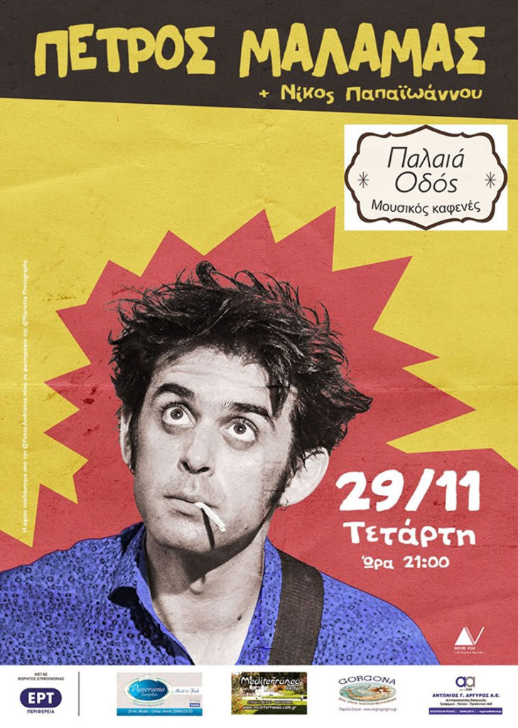 Ο Πέτρος Μάλαµας στην πόλη μας. Παρουσιάζει τραγούδια θεατρικά, καναδικά άσµατα, κοιτάσµατα, προγονικά κι ερωτικά. Μαζί µε τον Νίκο Παπαϊωάννου, ντουέτο µε κιθάρα, τσέλο, τζουρά, πληκτράκι, σύµφωνα και φωνήεντα. Η µουσική εξηµερώνει. Ελάτε, σίγουρα. Τετάρτη 29 Νοεμβρίου, Παλαιά Οδός, Αρχάγγελος Ώρα έναρξης: 21:00 Λίγα λόγια για τον Πέτρο Μάλαμα Ο Πέτρος Μάλαμας γεννήθηκε το 1983, […]