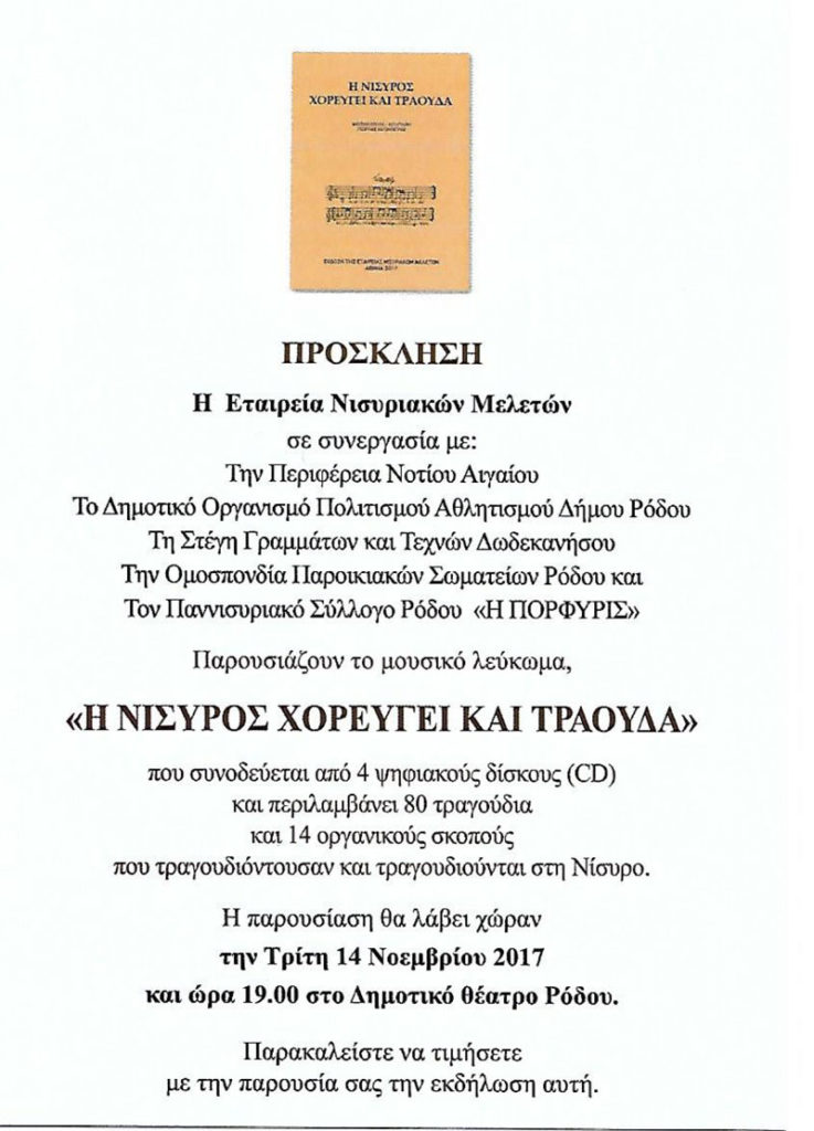 Η Εταιρεία Νισυριακών Μελετών σε συνεργασία με: την Περιφέρεια Νοτίου Αιγαίου, τον ΔΟΠΑΡ, την Στέγη Γραμμάτων & Τεχνών Δωδεκανήσου και τον Παννισυριακό Σύλλογο Ρόδου “Η ΠΟΡΦΥΡΙΣ” παρουσιάζουν το λεύκωμα: “Η Νίσυρος χορεύει & τραουδά”, που συνοδεύεται από 4 ψηφιακούς δίσκους […]