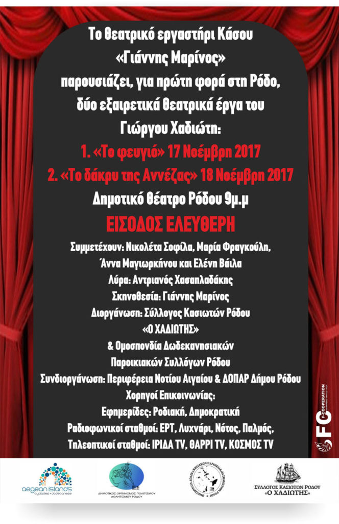O Δημοτικός Οργανισμός Πολιτισμού – Αθλητισμού Ρόδου, το Θεατρικό εργαστήρι Κάσου «Γιάννης Μαρίνος» και η Περιφέρεια Νοτίου Αιγαίου συνδιοργανώνουν δύο εξαιρετικά θεατρικά έργα του Γιώργου Χαδιώτη: «Το φευγιό», 17 Νοεμβρίου 2017 «Το δάκρυ της Αννέζας», 18 Νοεμβρίου 2017 Δημοτικό θέατρο Ρόδου – 9 μ.μ. Παίζουν: Νικολέτα Σοφίλα, Μαρία Φραγκούλη, Άννα Μαγιωρκήνου και Ελένη Βάιλα Λύρα: […]
