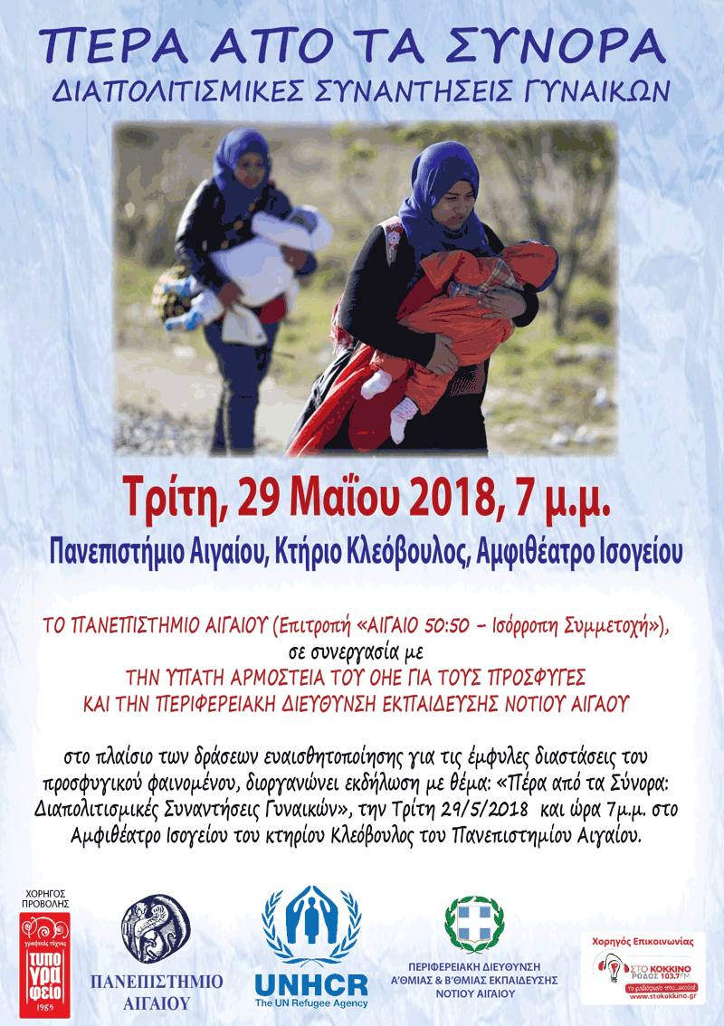 Η Επιτροπή «ΑΙΓΑΙΟ 50:50 – Ισόρροπη Συμμετοχή» του Πανεπιστημίου Αιγαίου, σε συνεργασία με την Ύπατη Αρμοστεία του ΟΗΕ για τους Πρόσφυγες, και την Περιφερειακή Διεύθυνση Α’θμιας & Β’θμιας Εκπαίδευσης Νοτίου Αιγαίου, στο πλαίσιο των δράσεων ευαισθητοποίησης για τις έμφυλες διαστάσεις του προσφυγικού φαινομένου, διοργανώνει εκδήλωση με θέμα: «Πέρα από τα Σύνορα: Διαπολιτισμικές Συναντήσεις Γυναικών», την Τρίτη 29/5/2018, και ώρα 7 μ.μ., στο Αμφιθέατρο Ισογείου του κτηρίου «Κλεόβουλος» της Σχολής Ανθρωπιστικών Επιστημών του Πανεπιστημίου Αιγαίου (Λ. Δημοκρατίας 1, Ρόδος).