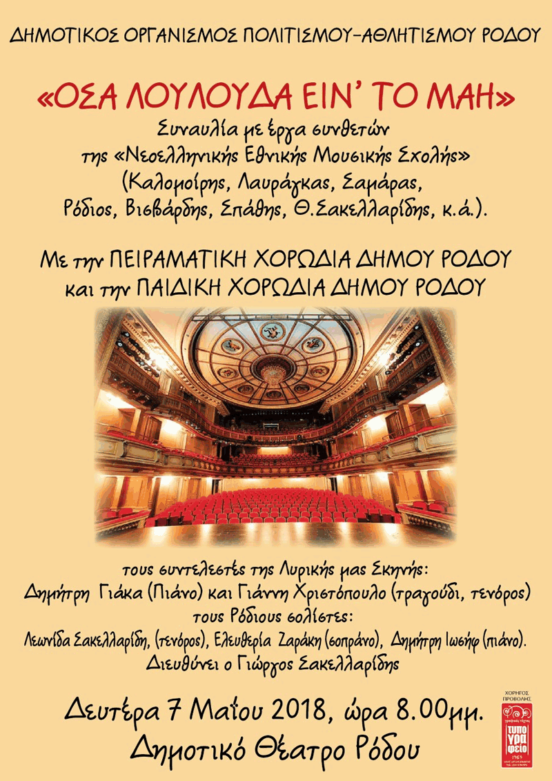 Ο Δημοτικός Οργανισμός Πολιτισμού – Αθλητισμού Ρόδου παρουσιάζει τη συναυλία με τίτλο: «ΟΣΑ ΛΟΥΛΟΥΔΑ ΕΙΝ’ ΤΟ ΜΑΗ», τη Δευτέρα 7 Μαΐου 2018, στις 8.00 μ.μ., στο Δημοτικό Θέατρο Ρόδου.