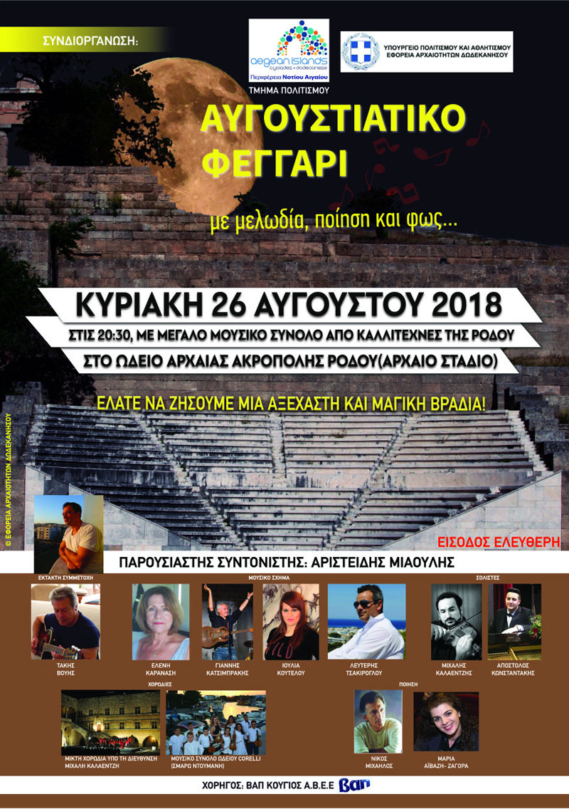 Το αναστηλωμένο Ωδείο Αρχαίας Ακρόπολης Ρόδου στο Αρχαίο Στάδιο, επέλεξε η  Περιφέρεια Νοτίου Αιγαίου να γιορτάσει την όμορφη βραδιά της 26ης Αυγούστου, όπου μέσα στην καλοκαιρινή νύχτα, θα πρωτοστατεί το λαμπερό φεγγάρι.