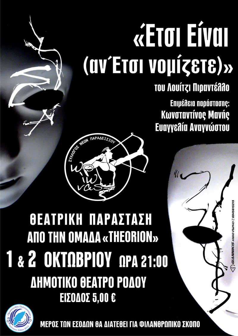Η θεατρική ομάδα Theorion του Συλλόγου Νέων Παραδεισίου «Ωρίωνας» μετά τις επιτυχημένες παραστάσεις στο Παραδείσι και στο Καστελλόριζο παρουσιάζει στην πόλη της Ρόδου την παράσταση «Έτσι είναι..αν έτσι νομίζετε» του Ιταλού νομπελίστα Λουίτζι Πιραντέλλο.