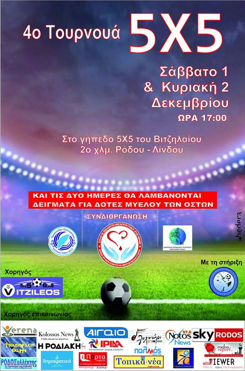 Ο Σύλλογος Εθελοντών Αιμοδοτών Ρόδου, σε συνεργασία με την Ομοσπονδία Πολιτιστικών Συλλόγων Ρόδου και τον ΔΟΠΑΡ, σας προσκαλούν να συμμετάσχετε στο 4ο Τουρνουά 5Χ5, το Σάββατο 1 & την Κυριακή 2 Δεκεμβρίου 2018 και ώρα 17:00, στο γήπεδο 5Χ5 του Βιτζηλαίου.