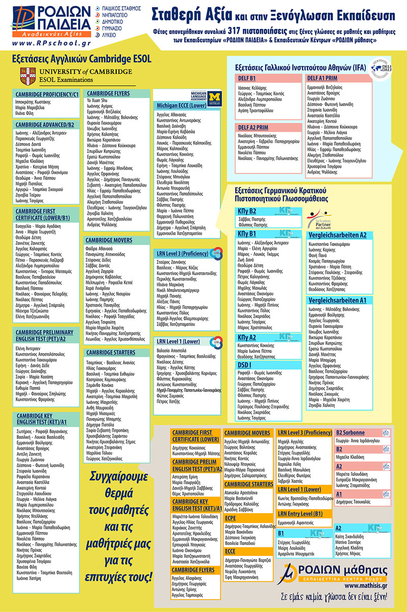 Η Διεύθυνση των Εκπαιδευτηρίων «ΡΟΔΙΩΝ ΠΑΙΔΕΙΑ» συγχαίρει θερμά τους μαθητές και τις μαθήτριες για τις σημαντικές επιτυχίες τους, καθώς επίσης και τους εκπαιδευτικούς ξένων γλωσσών που δίδαξαν και καθοδήγησαν αποτελεσματικά τους μαθητές και τις μαθήτριες.