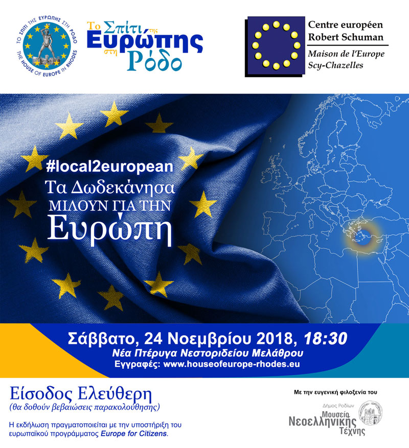 Το Σπίτι της Ευρώπης στη Ρόδο και το Ευρωπαϊκό Κέντρο Ρομπέρ Σουμάν (Γαλλία) διοργανώνουν την πρώτη από μία σειρά εκδηλώσεις με γενικό τίτλο «#local2european | Τα Δωδεκάνησα μιλούν για την Ευρώπη»!