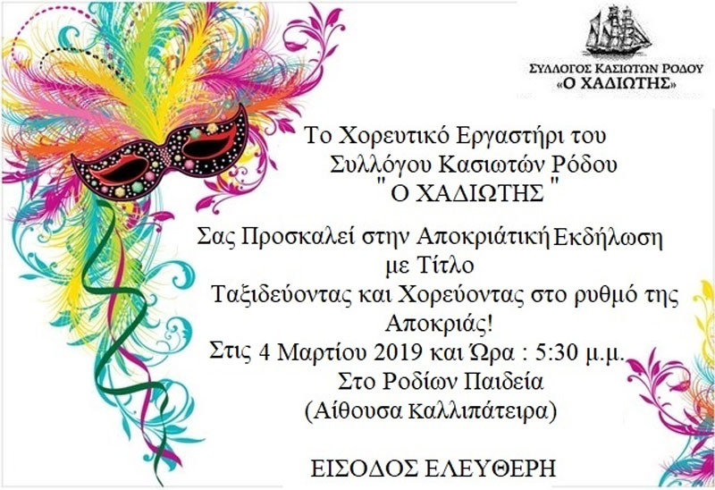 Σας προσκαλούμε στην Αποκριάτικη Μουσικοχορευτική Εκδήλωση μας, του Συλλόγου Κασιωτών Ρόδου Ο ΧΑΔΙΩΤΗΣ.