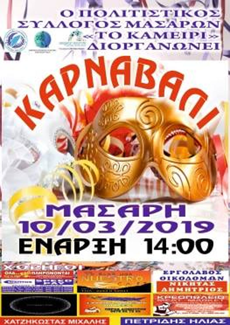 Ο Πολιτιστικός και Εξωραϊστικός Σύλλογος Μασάρων «ΤΟ ΚΑΜΕΙΡΙ» σε συνεργασία με τον Δήμο Ρόδου -ΔΟΠΑΡ διοργανώνουν Καρναβάλι στα Μάσαρη την Κυριακή 10 Μαρτίου 2019 και ώρα 14:00.