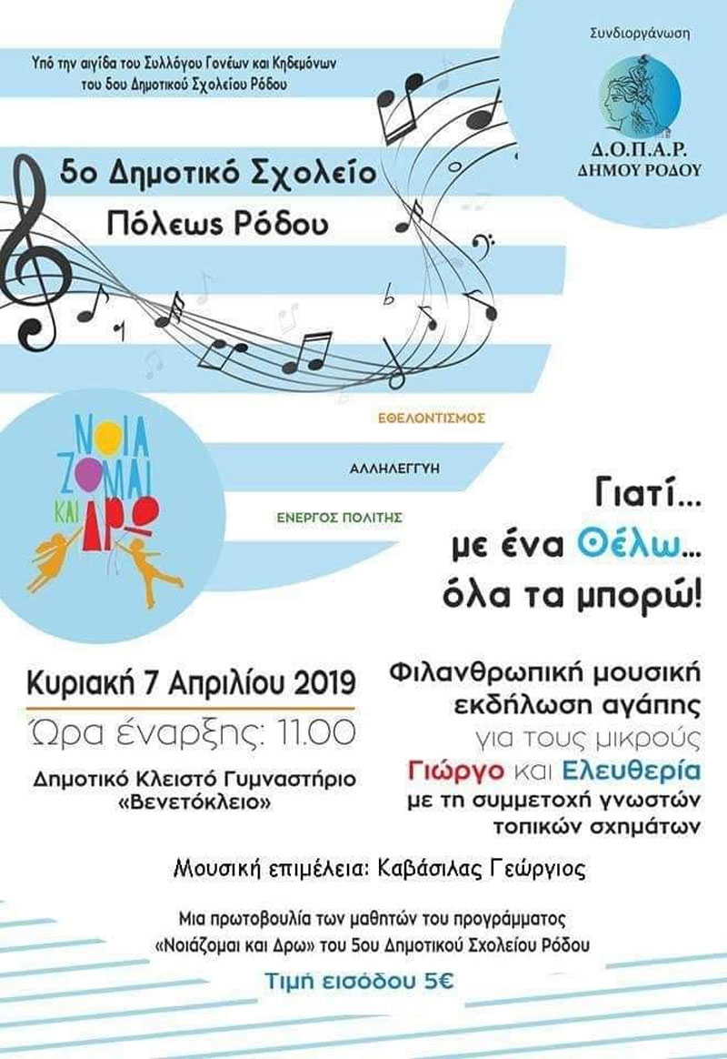 Μουσική εκδήλωση με την συμμετοχή γνωστών τοπικών σχημάτων και με φιλανθρωπικό σκοπό, θα πραγματοποιηθεί την Κυριακή 7 Απριλίου 2019.